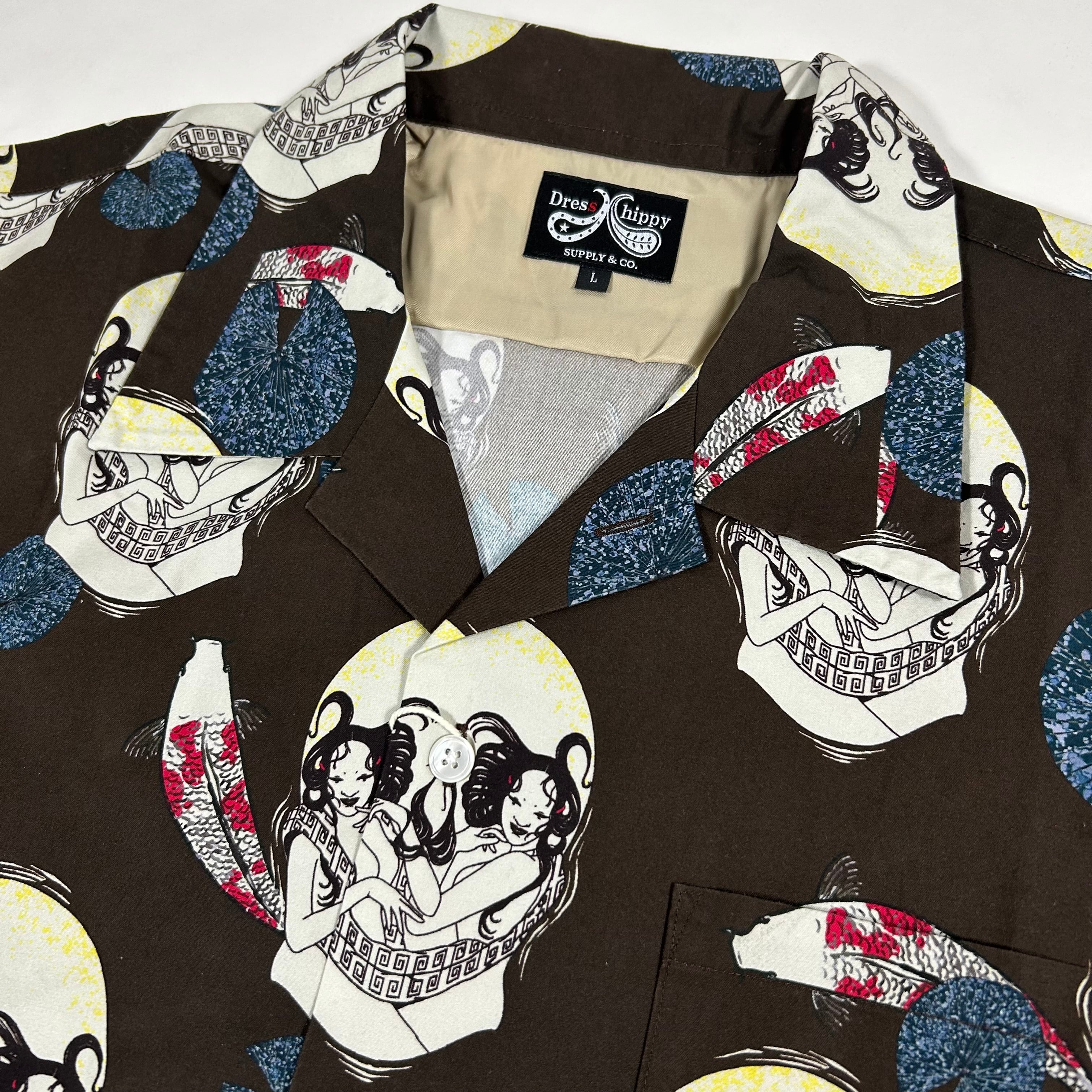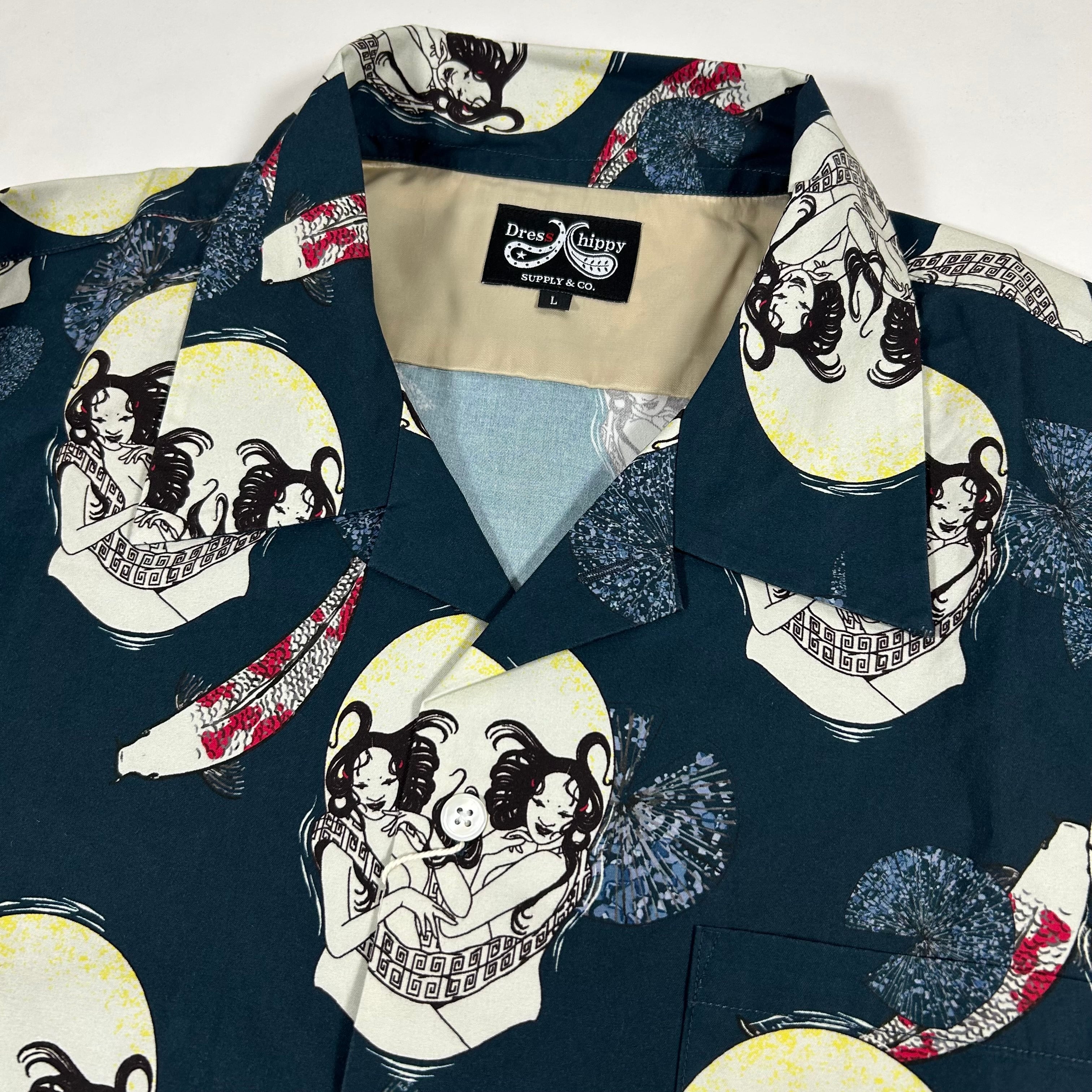 一見、スカルモチーフの総柄に見えますが、水面に映る能面の女性2人と月と鯉と蓮の葉のデザイン。