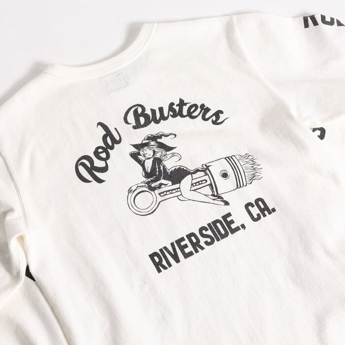 サイドバルブレーサーWRのピストン&コンロッドに跨る魔女で描くROD BUSTERS。ウエストライドが生み出した造語はHOT RODのさらに上をいく、RODが折れる程のハイコンプを意味し、限界点ギリギリまで突き詰める気概を表現。2014年に生み出した名作フレーズ&グラフィックを今のシーンに落し込んだWEE氏描き下ろしの力作。別の意味もあるがそれは想像にまかせます。
