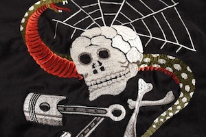 巳年でもある今季コレクションの中でも一際目を惹くアイコンとしてリリースするメインアイテムはリバーシブル仕様のスーベニアジャケットで。背面に大きくデザインされた刺繍には永遠のバイカーというテーマをスカル&ピストンのデザインをアイコン的に用いて表現。「好きなものに囚われて生涯を共にする自身のライフスタイル」という摂理を謳っています。一方、逆面のバック刺繍はVINTAGEオリジナルに忠実なSKULL/EAGLE/MT.FUJIを力強く描き、その刺繍は新潟の職人による丁寧な手作業で仕上げています。生地の片面には通気性に優れた綿100%による別珍素材。もう一方の面には、経糸はフィラメント糸で光沢を表現しながら、横糸にスパン糸を使用して膨らみも再現したレーヨン100%を採用。また、インシュレーションにロータスサーモを装備することで程よい保温性も確保。WALDES RV ZIPPERを使用。発売前から問合せの絶えない一枚です。