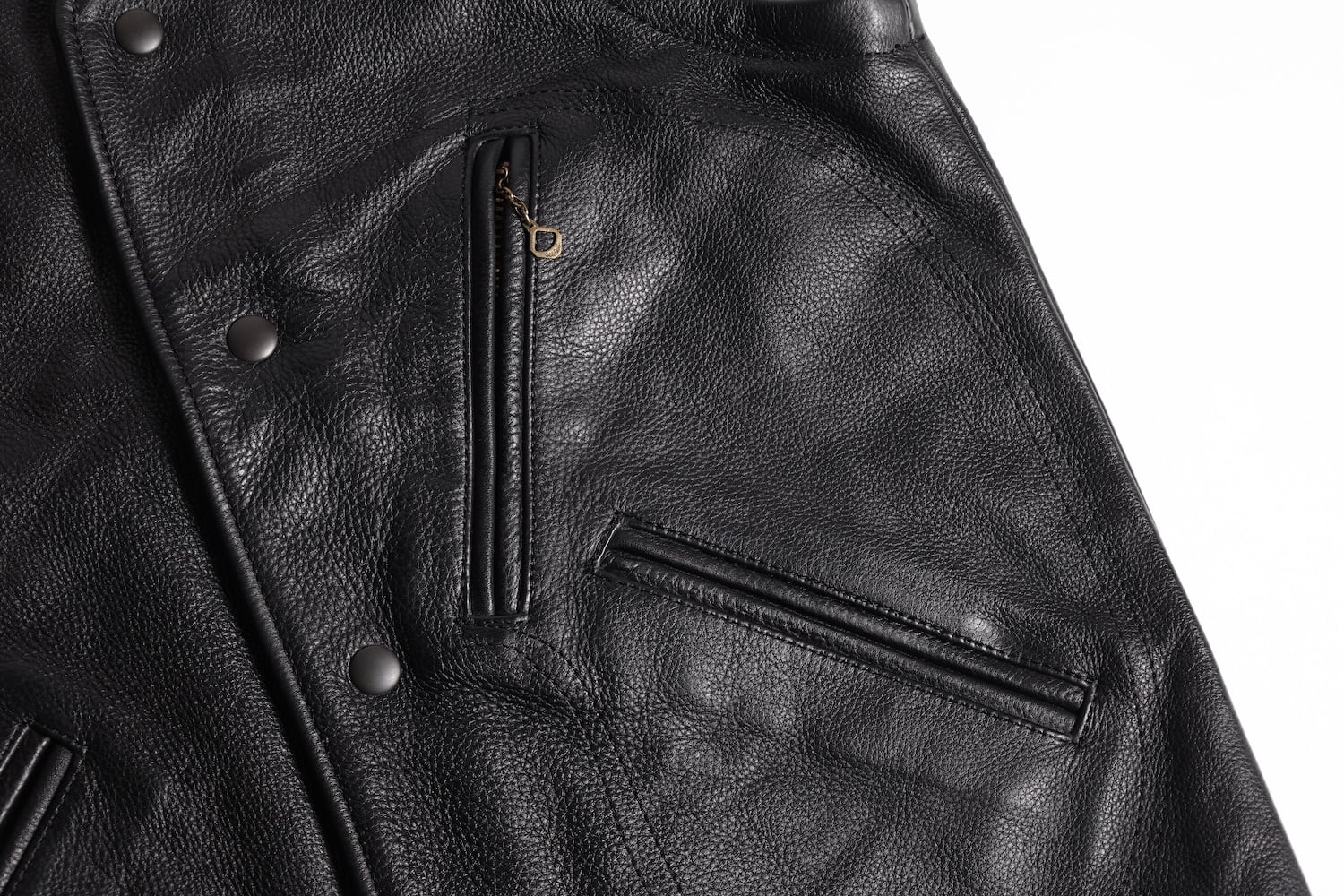 1930〜40年代ヴィンテージにおいて高い人気を誇った変形Dポケットを、WALDES製・7連鎖チェーンジッパー仕様で再構築した、独創性と実用性を兼ね備えるレザーベスト。