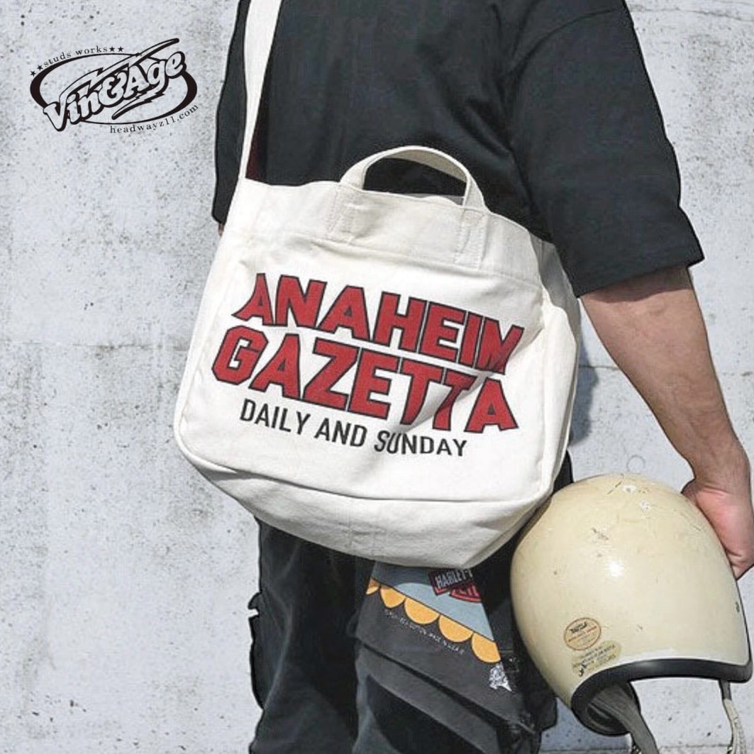 アメリカでバイクイベントが開催される都市の昔 実際に発行されていた新聞紙名をプリントした ニュースペーパーバッグ。