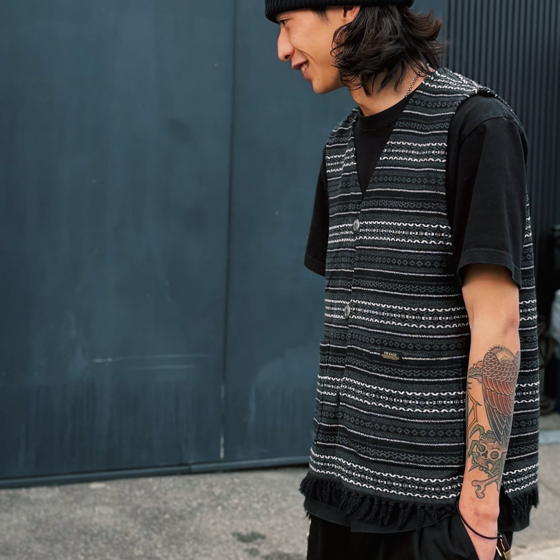 メキシカンラグポンチョの生地を贅沢に使用した、存在感抜群のコットンラグベストです。