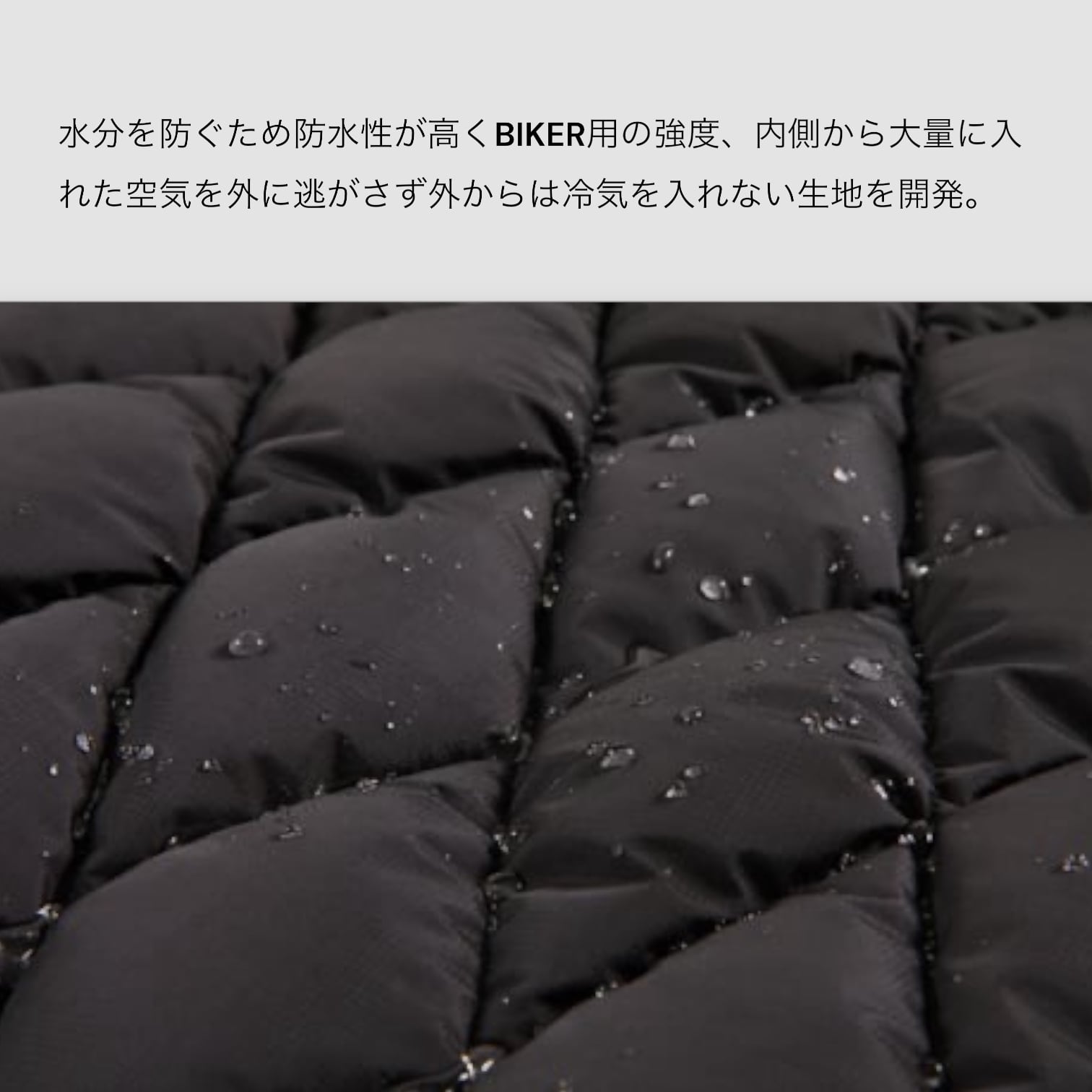 DOWNの一番の敵、水分を防ぐため防水性が高くBIKER用の強度、内側から大量に入れた空気を外に逃がさず外からは冷気を入れない生地を開発。使用するSHELLはORIGINALで開発された3層(耐水圧23000mm透湿性11500g/24H)FABRICで、ダウンボールを雨、風から守ってくれます。